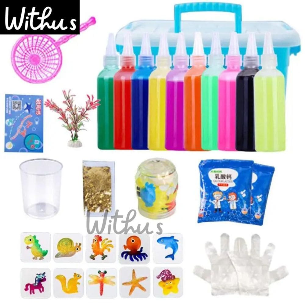 - 6 moldes aleatorios, 4 geles de color, 1 esfera de observación, 1 polvos de hadas (lactato de calcio), 1 barra, 1 estuche, 1 red de pescado, 1 cepillo