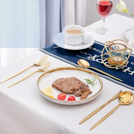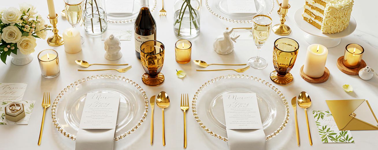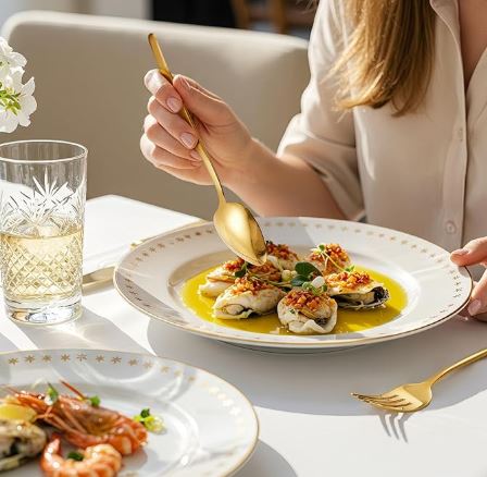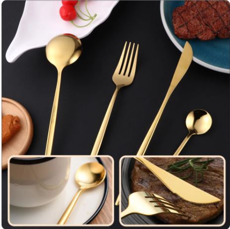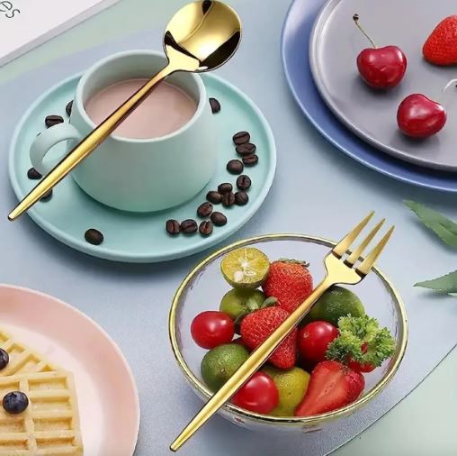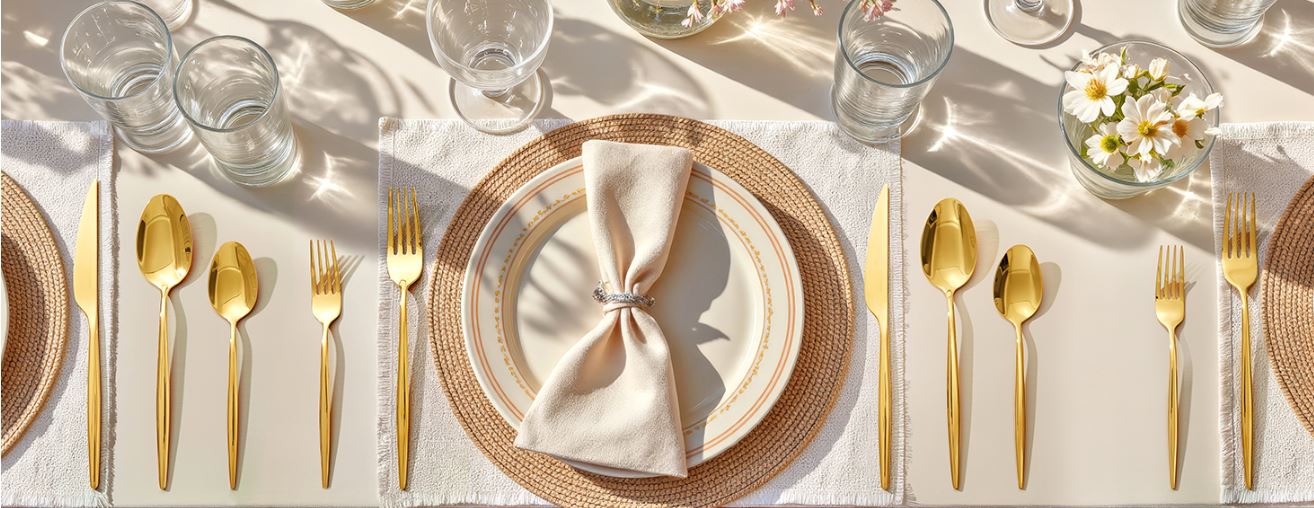 Imagina tu mesa transformada: Cada plato servido con cubiertos que deslumbran por su brillo dorado, transmitiendo lujo y buen gusto.